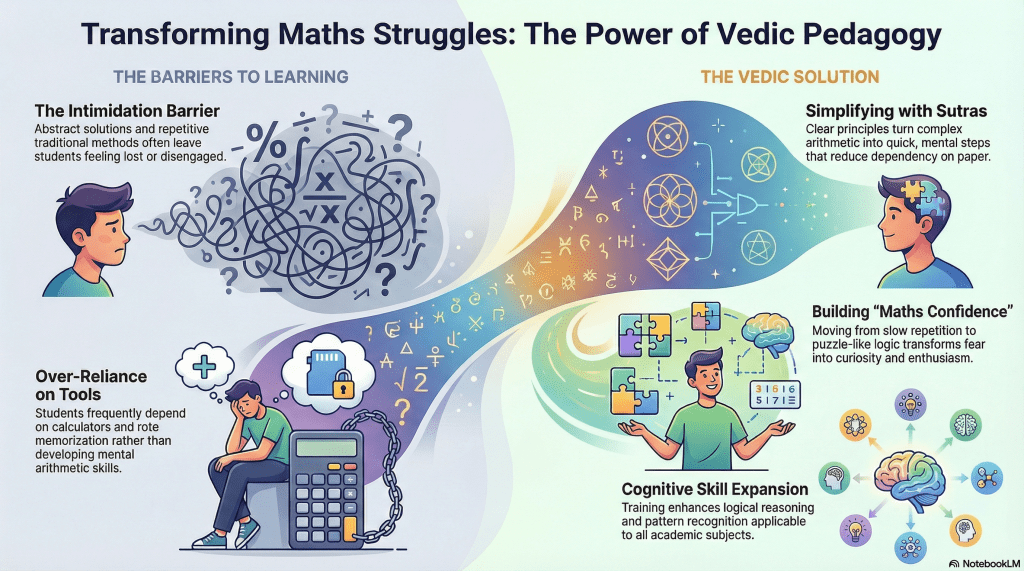 This infographic by AristoKids highlights how traditional math challenges—like fear, confusion, and over-reliance on calculators—can be transformed through the power of Vedic Pedagogy. By simplifying complex arithmetic using clear sutras and mental techniques, students build strong problem-solving skills, logical thinking, and true maths confidence. AristoKids focuses on turning intimidation into curiosity, helping children master numbers faster, think smarter, and develop lifelong cognitive skills beyond the classroom.